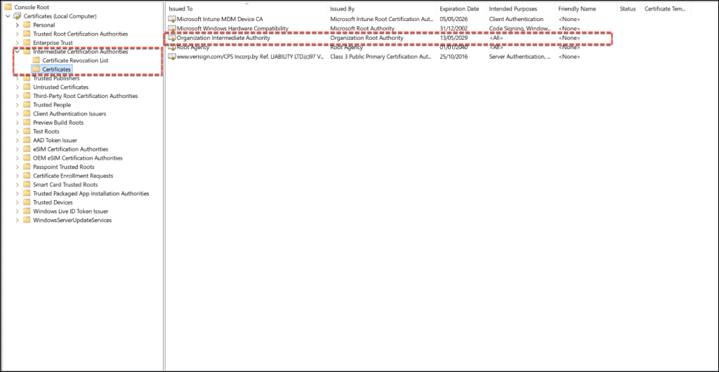 Verifying the Root Certificate in the Intermediate Certificate Authorities Store