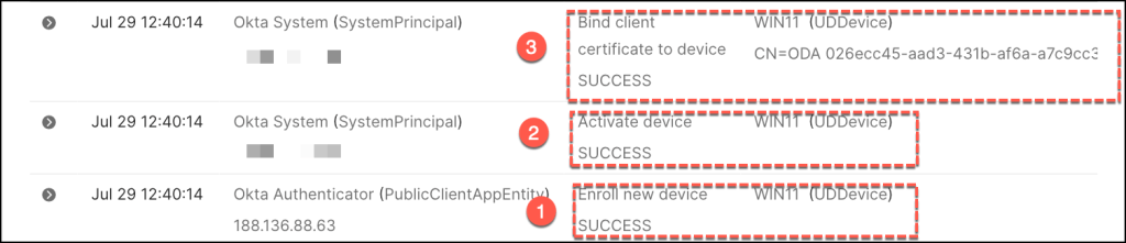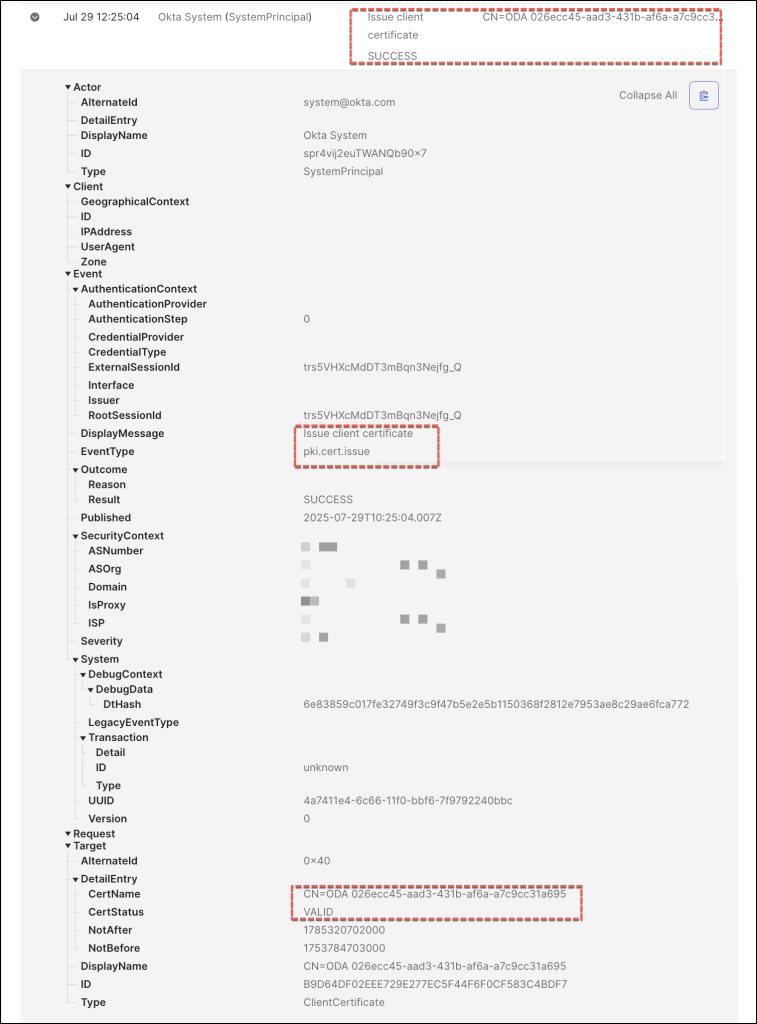 Within the Okta System Log, you should observe a record confirming the successful provisioning of the client certificate to the target device